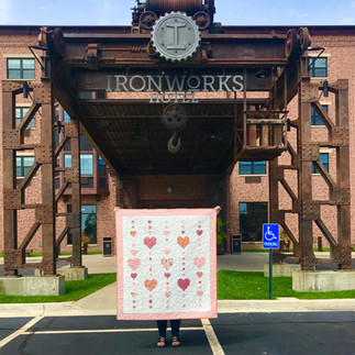 When I got the very exciting email from the magazine that they would like to use my design in an upcoming issue I was in the middle of packing up my house in preparation to move from Kansas to Illinois. There was no way I could pass up on this opportunity, so I did what any quilter would do. I became a quilty super woman! This was in July 2021. I had about 5 weeks before the quilt was due to the magazine. It was a tight turnaround. I had to have the fabric shipped to my only known friends house in Chicago, about an hour and a half from where I was going to be living because the fabric would not have made it to me in time before we moved. It took about two weeks before I could get the fabric and start on the quilt. 3 weeks left in my timeline. My family and I were waiting to close on our new home in IL, so we stayed in a hotel. That lasted for 40 days. I brought my essential sewing supplies with me to the hotel and in 2 days I completely made the quilt top. In the hotel!!! That was a first for me. I have never made a quilt in a hotel before. Thank goodness it was a small quilt and not the throw size I proposed! I didn’t have much time because I needed to send it to my quilter, Megan in Texas. (Check out Megan or Siren Stitching) Megan was a quilty super woman and had the quilt quilted and sent back to me within a week. I quickly put the binding on, took some pictures and sent it on its way. Whew, that makes me tired thinking about it. It will be a memory I have forever. I bet housekeeping is still finding threads. See some of the pictures below.